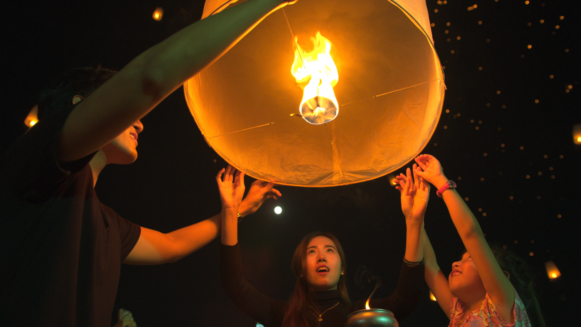 夜空に飛ぶ無数のランタンが生み出す光景はとても美しく幻想的です。